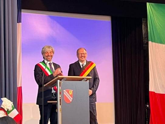 Gleich am Anreisetag wurde das Jubiläum am Abend im Bürgerhaus mit einem offiziellen Festakt und 220 geladenen Gästen gebührend gefeiert. Bürgermeister Markus Hennemann blickte in seiner Festrede zurück auf die Entstehung der Städtepartnerschaft vor 25 Jahren, die durch die Initiative von italienischstämmigen Bickenbacher Bürgern, die aus dem süditalienischen kleinen Ort stammen, zum Leben erweckt wurde.